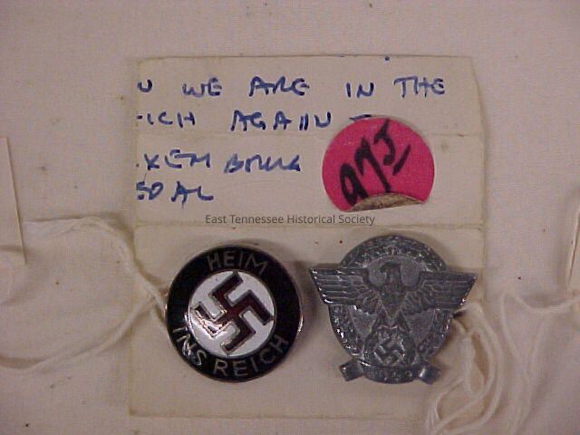 "Tax button" required of Luxembourg citizens to be purchased each month and worn consistently, silver colored metal, eagle design, Nazi Germany, 2 1/2"w x 2 1/4", 1938-1944.Collection