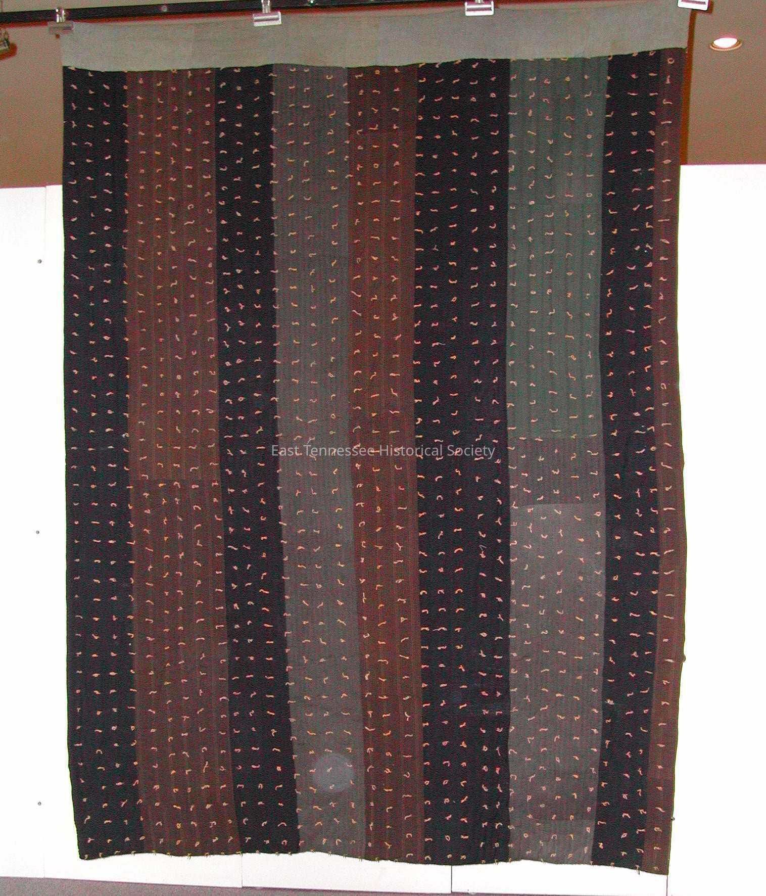 Quilt made by Amanda Wylie McCrary from suits of her son Albert Rose McCrary, bar quilt pattern/vertical blocks of varying widths, pieced, machine sewn, black, brown and gray wool fabric, self bound, no border, square corner, cotton backing, cotton thread, cotton batting, tacked with twine cotton, 5" whisker guard turned to back, c. 1911-1912 (per donor).Collection