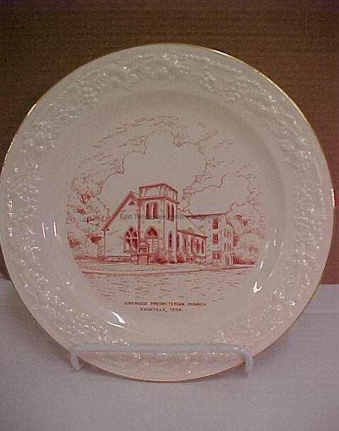 Souvenir plate, marked "KIRKWOOD PRESBYTERIAN CHURCH/ KNOXVILLE, TENN.," red illustration of church on off-white background, raised fruit-and-leaf design around rim with gold edge, text on back tells of the church's founding, "World Wide Art Studios/ Covington, Tenn.", "Homer Laughlin," 9 3/4" diam.Made/Created