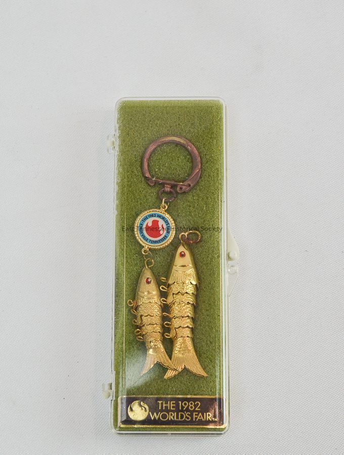 Key chain, "Worlds Fair", "fish". Keychain in clear and white plastic case, with two gold fish charms made of multiple pieces to allow movement similar to a fish. Fish are gold colored with red jewel eyes. There is a gold-lined charm connecting the fish to the clip, with a white background, blue circle reading "The 1982 World's Fair. Knoxville, Tennessee", with red flame in center. In the case alongside the keychains is a small black and gold label.Dimensions