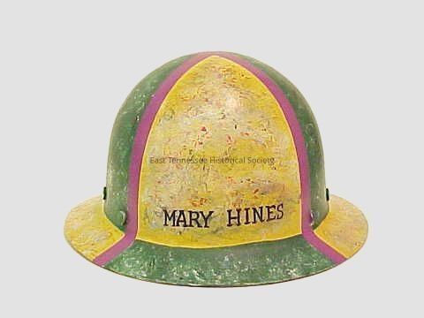 Hard hat, marked "MARY HINES" in black lettering at front center, purple X old style without bill, 1960s.