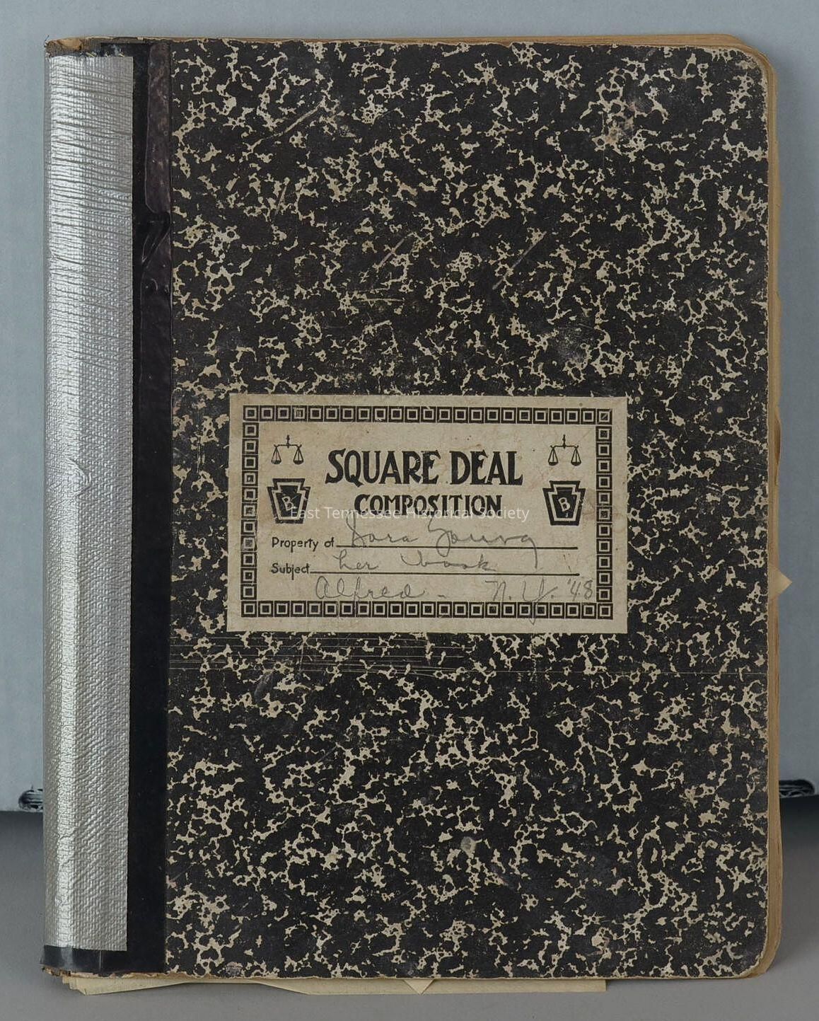 Notebook dating to Sara B. Young's student days at School of American Craftsmen (Alfred, NY), black-and-white marble-print cover, marked "SQUARE DEAL / COMPOSITION" and "Sara Young / Subject: her book / Alfred-N.Y. '48," contains thoughts and notes on her pottery making, duct tape over binding, 9 1/2"h x 7 1/2"w, 1948.Made/Created