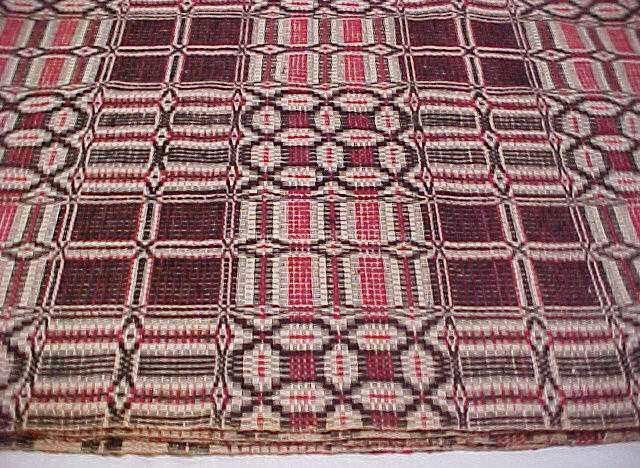 Overshot coverlet woven in Pigeon Forge (Sevier County), "Tennessee Trouble" pattern (according to Clinch Valley Handweavers Guild), wool and cotton, three colors--red, dark brown and natural, two sections with center seam, side with more red turned to back to form hems along width, approximately 95" long x 70", c. 1865.Made/Created