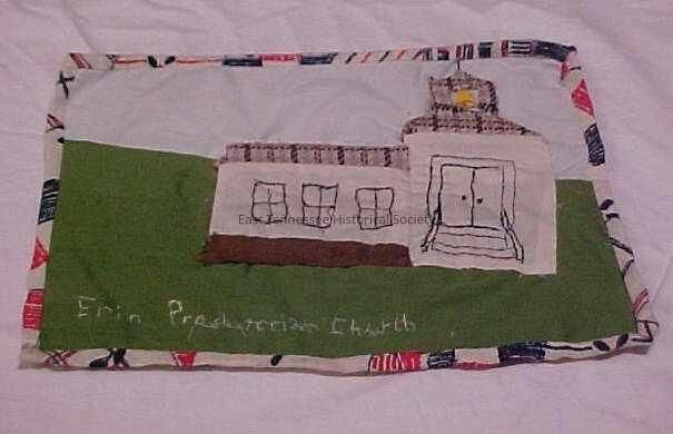 Quilt block depicting Knoxville's Erin Presbyterian Church. Body of structure is light tan with three windows on the left and double-door entrance on right, above which is the steeple, with its yellow bell. Steeple and roof are in a tan-and-black striped fabric. Upper third of background is pale blue; lower two-thirds is green, with "Erin Presbyterian Church" stitched in white thread along lower edge. Binding is red, white, and blue; backing is solid white with some stitching showing through. Stitching is crude and some shows through on the solid white backing. Unsigned. Early 1990s (1993 or before).Collection