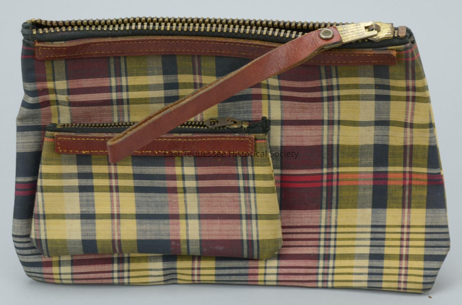 Purse of Sara Elder, madras plaid cotton exterior, attached compartment, 7" long leather wrist strap, leather trim, black fabric and brass metal zipper, leather trim on compartment as well, vinyl lining, unknown manufacturer, 11"h x 7"w, early-to-mid 1960s.