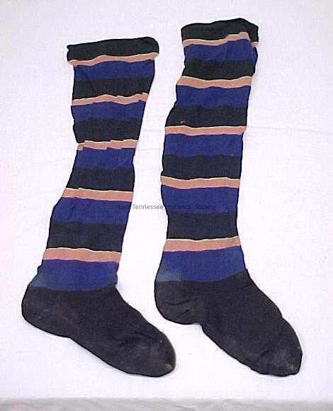 Baseball socks ("men's hose") worn by John Monroe Clark, striped in salmon, lime green, purple and black, factory made, 24"h x 9 1/4"w at foot, 1894.