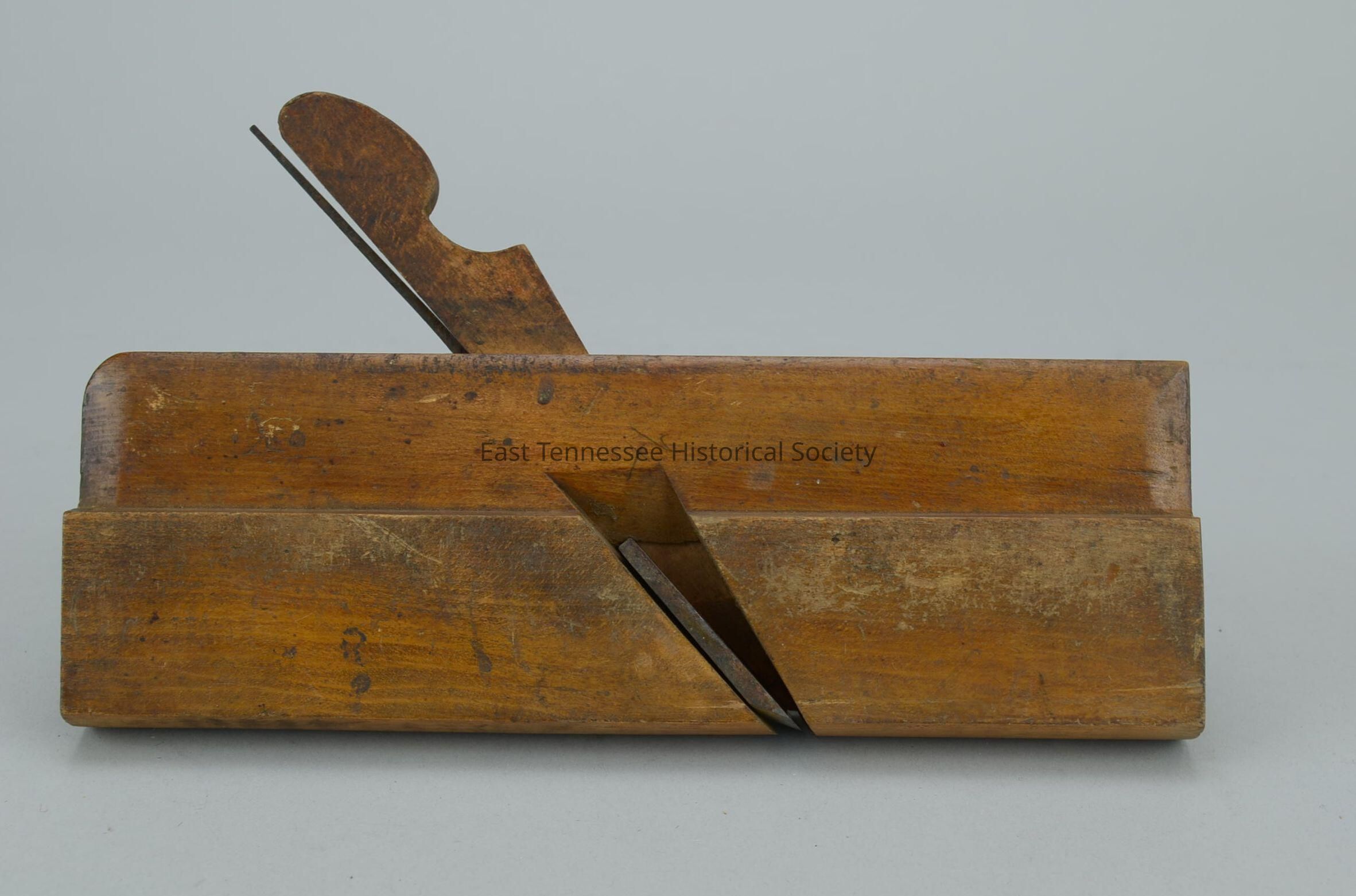 Molding plane (makes groove), No. 7 (radius), wood rectangle, diagonal cut top to bottom with blade and blade holder, 1 1/4"w curved blade, stamped "OHIO TOOL CO [with logo]" at front, "Thos. Holliday & Co Cin. O" [seller] on front, "J.H. Wheeler" [previous owner}, manufactured by Ohio Tool Co. (Columbus)/sunburst logo, THOS. HOLLIDAY & CO. / CIN. O." [company that sold it] in two lines of arching lettering, JH WHEELER [previous owner of the plane], 5 1/4"h x 9 1/2"w x 1 1/2"d, 1851-1913.