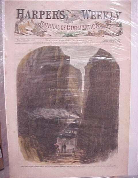 Harper's Weekly (11/07/1863), "The Army of the Cumberland--A Troop Train passing through the Big Cut on the Louisville & Nashville Railroad," 16 1/7"h x 11 1/8"w.Dimensions