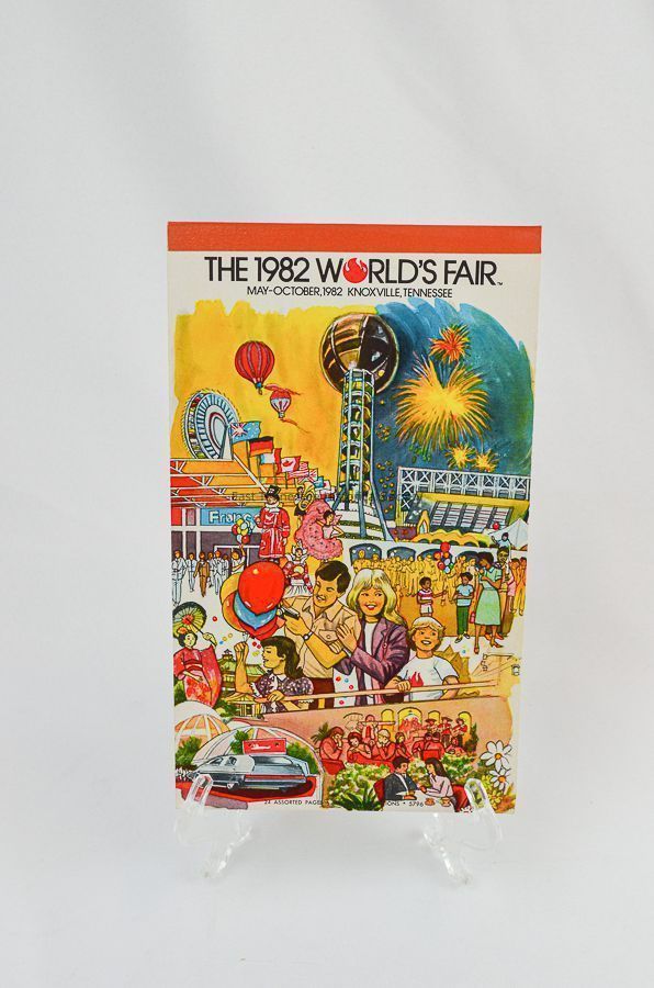 "World's Fair" notepad, "Knoxville", "1982". Front cover illustrates multiple scenes from the 1982 World's Fair, including a stadium, flags, a family in the center, futuristic cards, a crowd, fireworks, and balloons. Each page has an illustration repeated on the bottom edges of the paper. The spine of the book is orange in color. 24 assorted pages.Dimensions