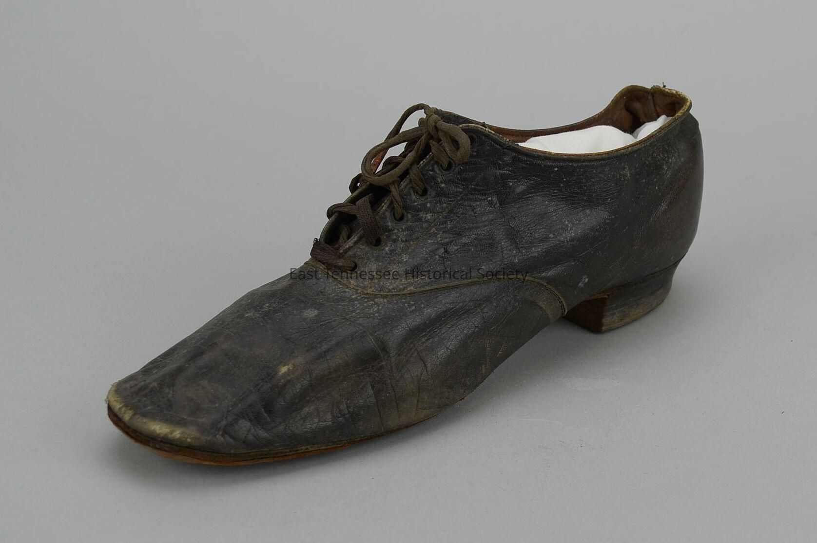 Pair of ankle-high shoes of Lena Elliott Lewis, black leather/cloth shoestrings, interior sole marked "Martin, Tenn.," early 19th century.Made/Created