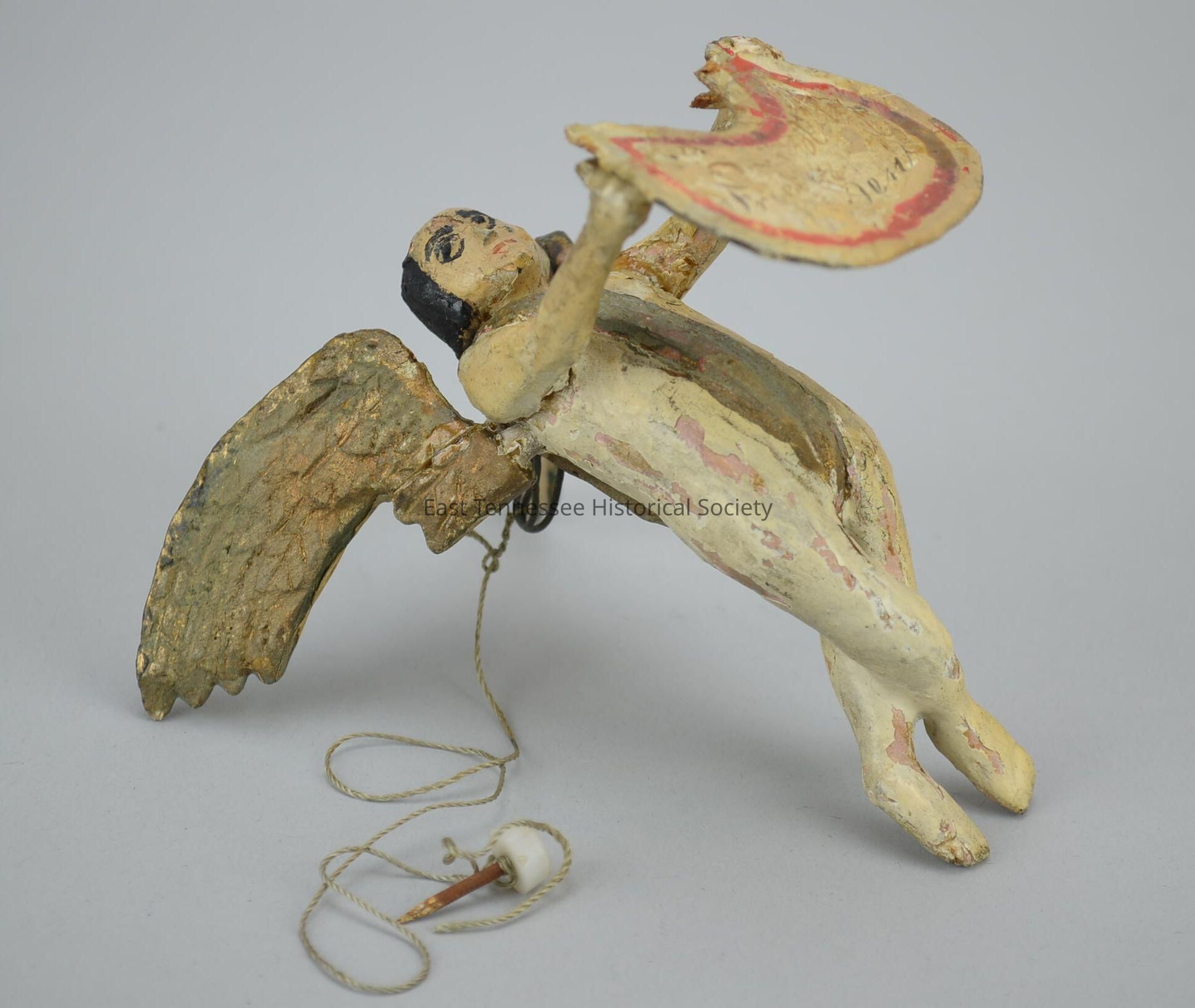 Carved figure of Gabriel, painted wood, white (peeling) over pink figure, black hair with front receding hairline, black eyes, legs crossed at knees, arms stretched holding banner (words illegible) with red trim, gold sash wraps from shoulder through grain, gold wings (left one broken and repaired) with metal staples in center shoulder area, metal loop attached to 9 1/2" string and thumbtack with white plastic head, made by Fickey family (Germany), 2 3/4"h x 3 5/8"w x 4 3/4"d, 1780-1880.Made/Created