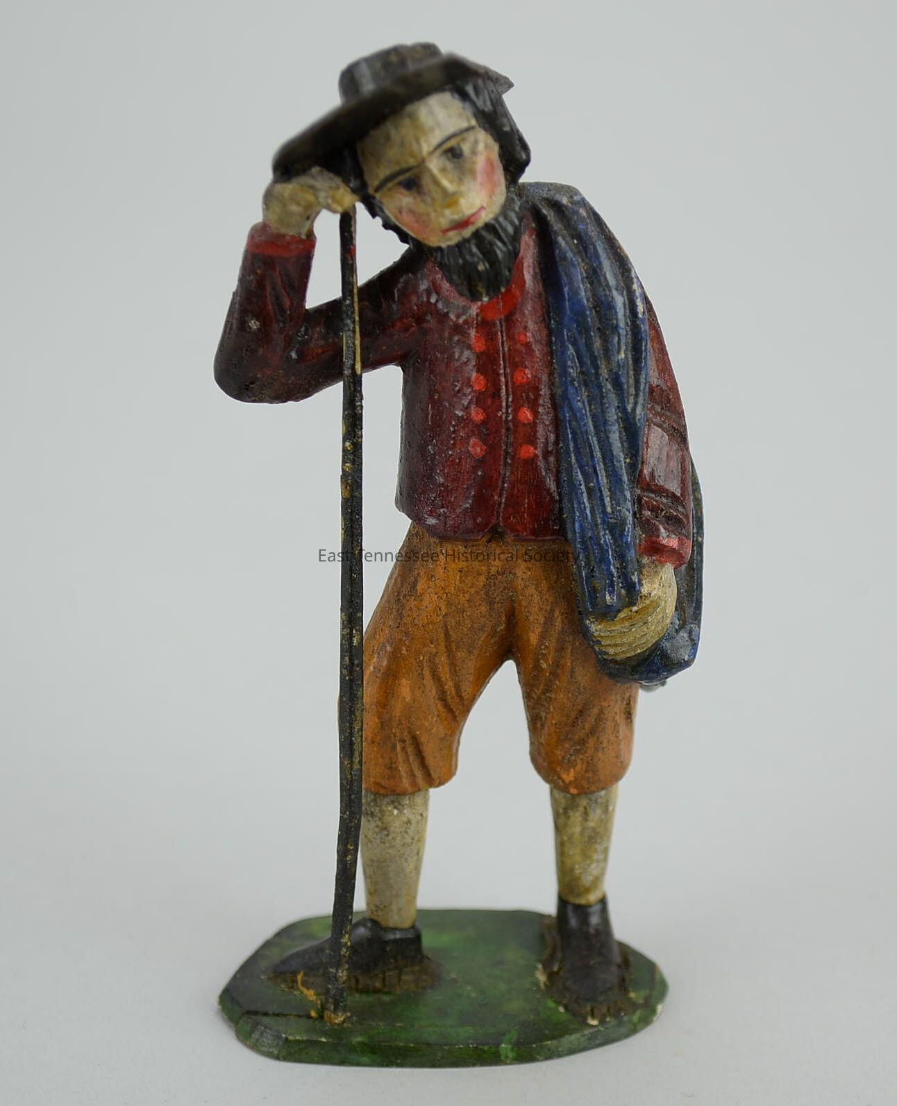Carved figure of standing shepherd, painted wood, holds black staff with right hand and leans head against its top, brown eyebrows, black eyes, red mouth, black Amish-style beard, brown wide-brim hat, blue blanket over left shoulder, burgundy jacket with red buttons and trim, orange breeches, black shoes and no stockings, green base, made by Fickey family (Germany), 4 15/16"h x 2 1/4"w x 1 7/16"d, 1780-1880.Made/Created