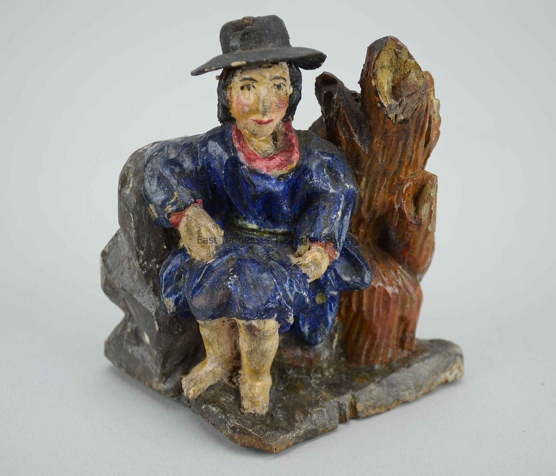 Carved male figure, painted wood, sits on gray rock and brown tree trunk base, black wide-brimmed hat, black hair/eyebrows/eyes, prominent nose, red mouth, knee-length blue tunic with red collar and cuffs, black belt, bare legs, carved "A" on back side of rock, made by Fickey family (Germany), 4"h x 3 7/8"w x 2 1/4"d, 1780-1880.Made/Created