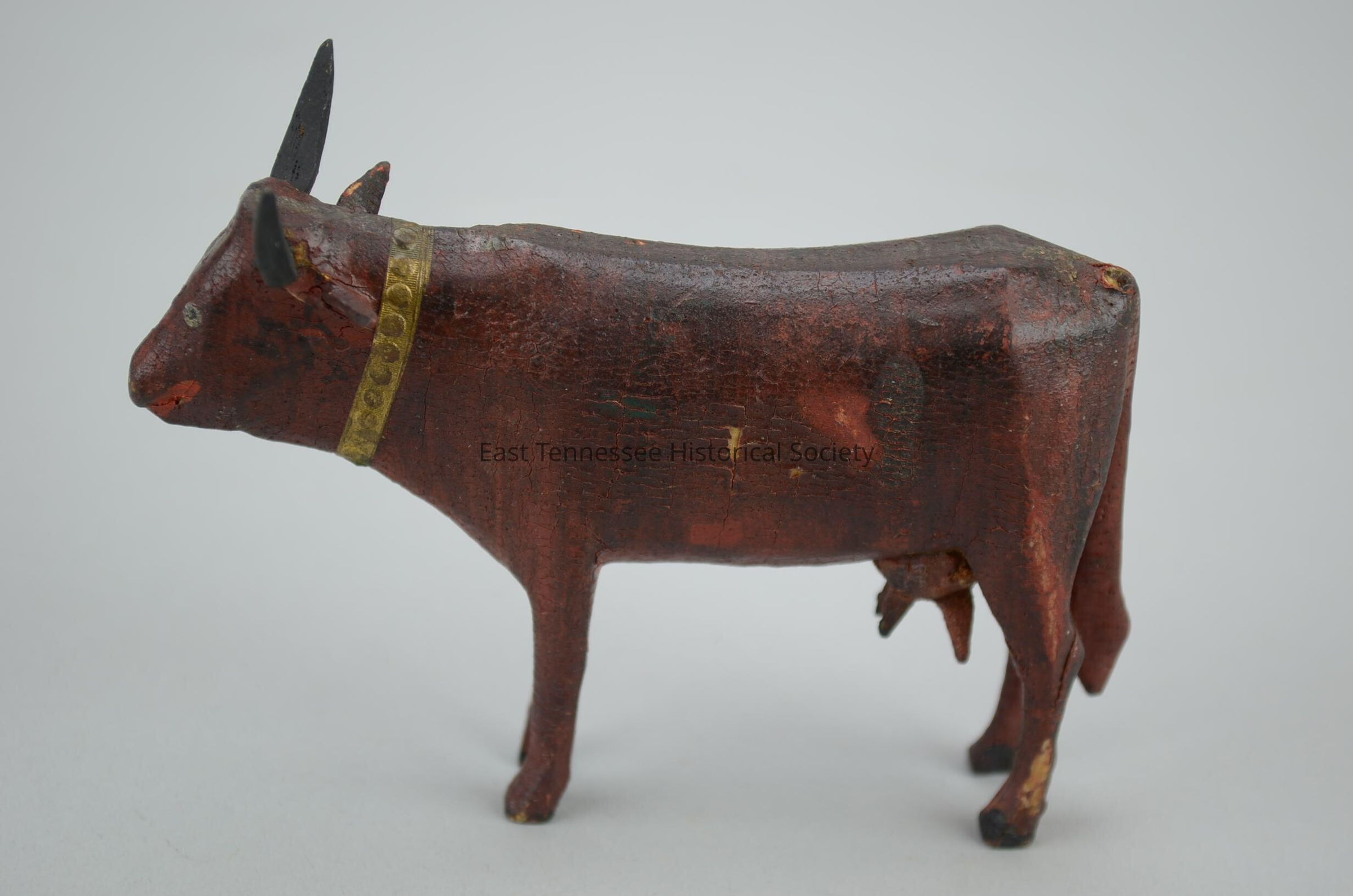Carved cow, brown-painted wood, black eyes and horns, red mouth, gold metal collar around neck, made by Fickey family (Germany), 3 3/16"h x 1 9/16"w x 4 5/16"d, 1780-1880.Made/Created