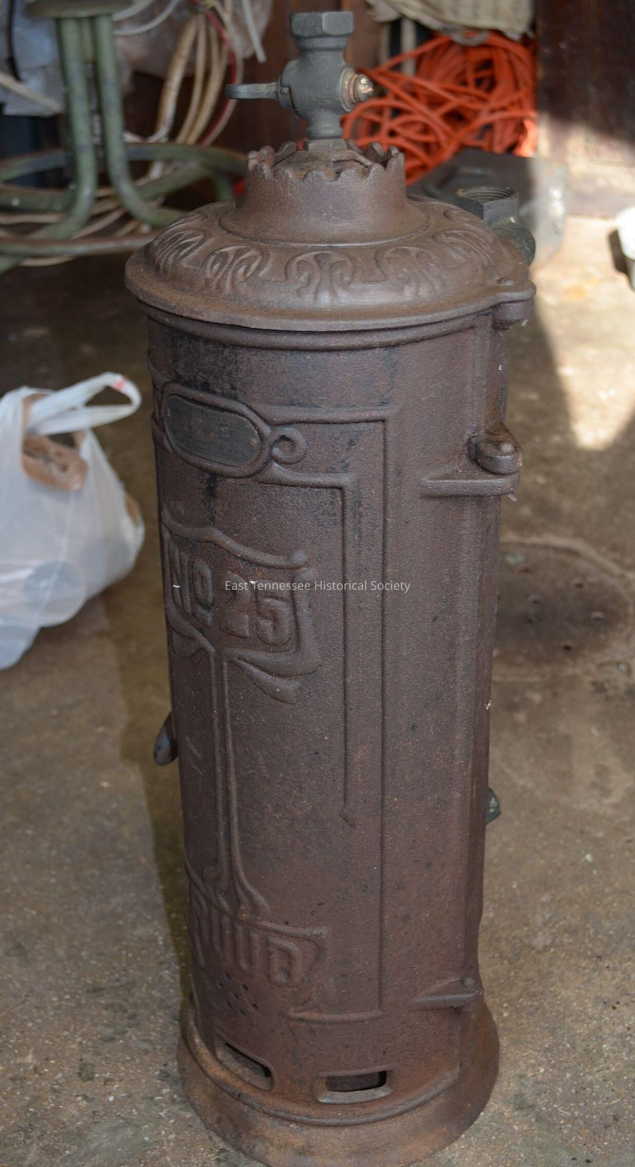 Water heater with interior coil manufactured by Rudd, cast iron with copper coil, marked "No. 25," roughly 23"h x 9" diam., early 20th century/c. 1913