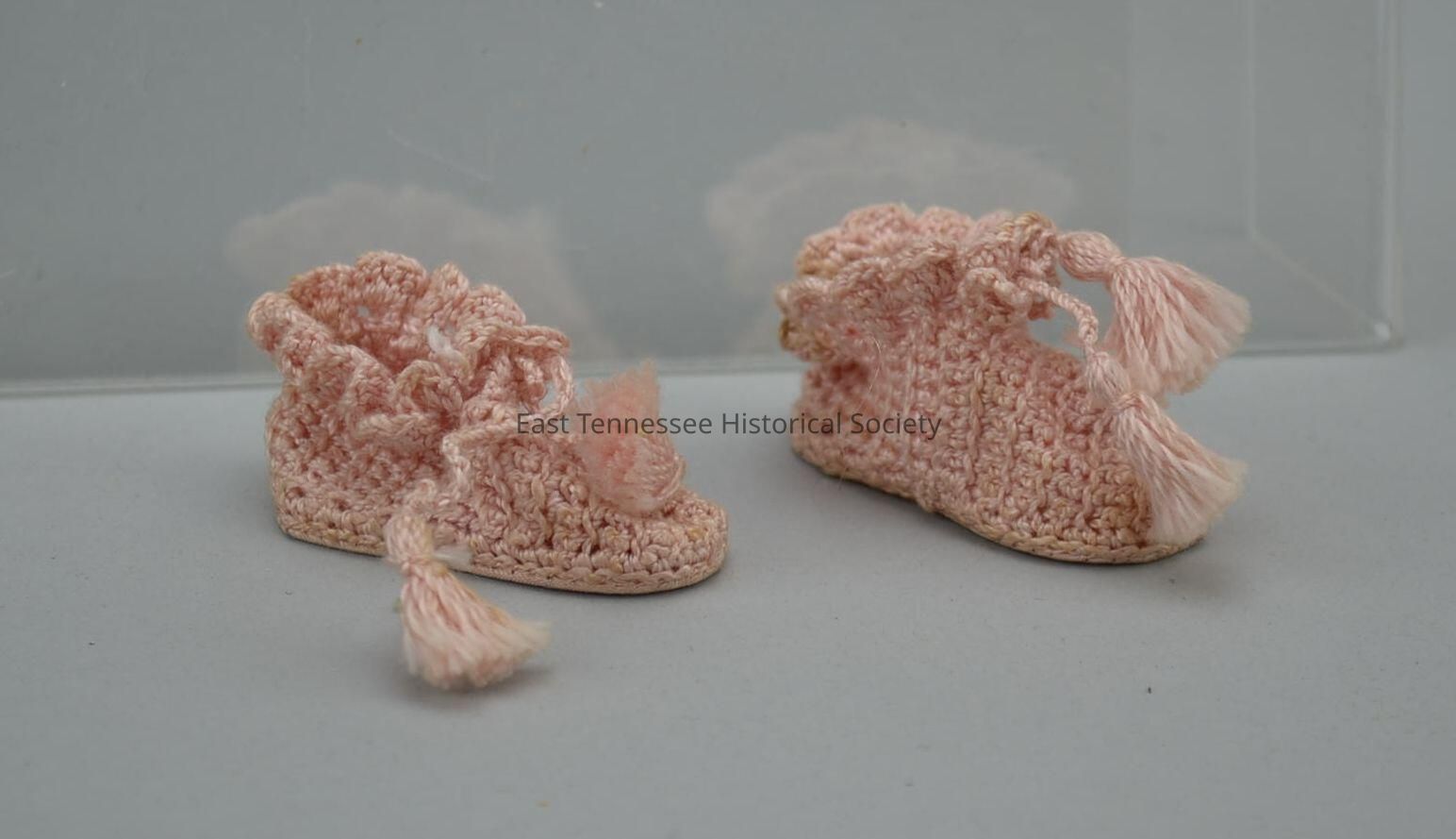 Doll booties, pink pearl cotton, crochet with one row of posts to thread, finished with scalloped edge, crochet chain ties with tassel trim, sewn on satin hard paper soles, 1"h x 1 7/8"w x ?d, maker unknown, c. 1911.Made/Created