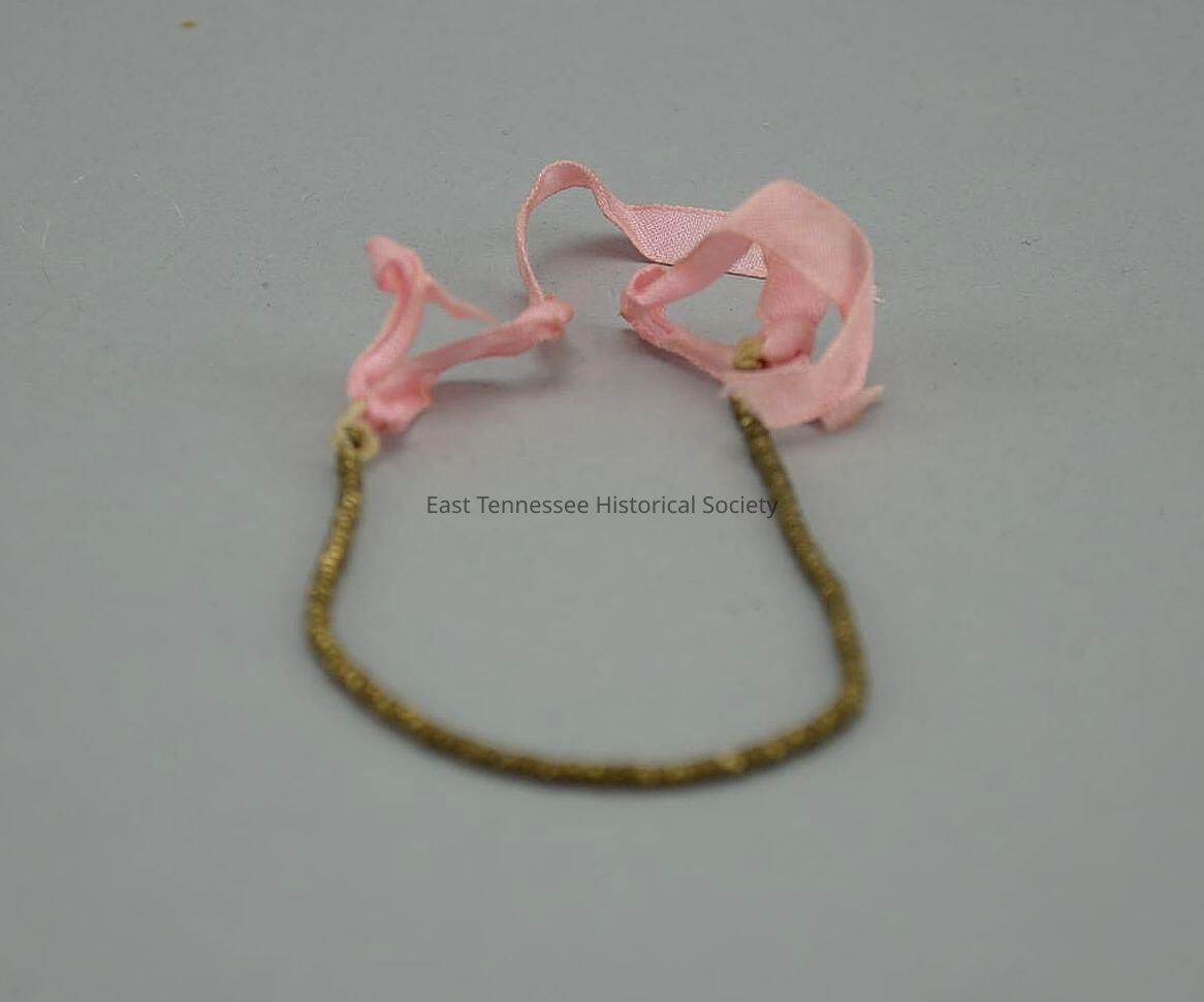 Doll necklace made (by tradition) by Margaret Cecil Peak Bundren, gold glass beads strung onto narrow pink ribbon with half bow and 3" tie sewn to each end, 1/4"h x 11"w, c. 1911.Made/Created