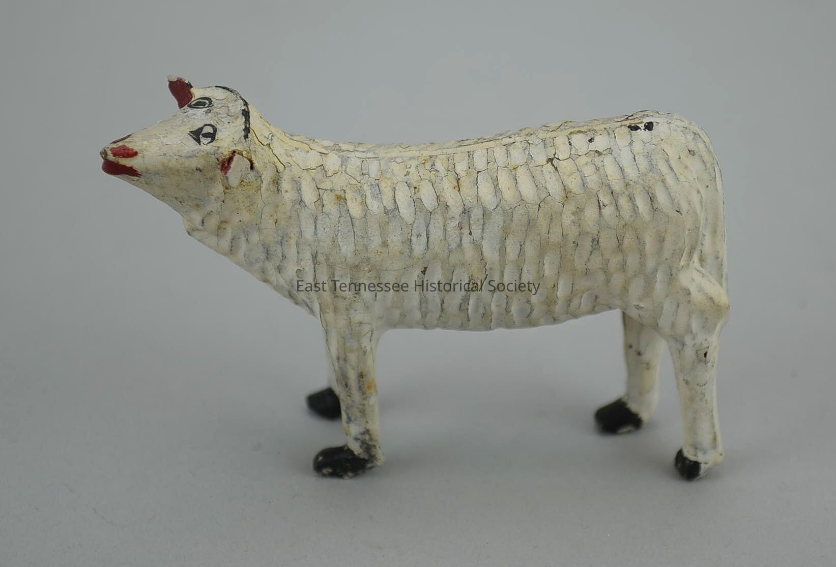 Carved sheep, white painted wood, head raised and turned slightly to left, dimpled fleece with symetrical pattern groove along spine,, black eyes/surrounds/brow ridge, red mouth/nose/ears, black hooves, made by Hickey family (Germany), 2"h x 7/8"w x 2 7/8"d, 1730-1880.Made/Created