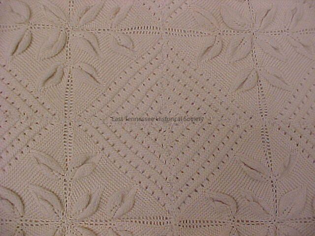 Ivory cotton thread bedspread believed made by Ellen McClary Carmichael. Pattern has six-petaled flowers separated by hexagons. Each petal of the spread has nine popcorn's attached in a diamond shaped pattern. Edges of spread are slightly scalloped.Made/Created