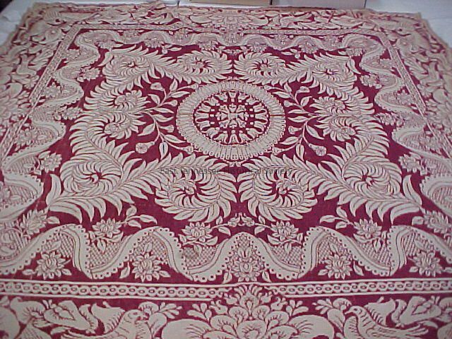 Jacquard coverlet (machine woven), red wool and natural color cotton, eagle and script initials "MWM" and "Tenn." in each corner, center medallion bordered by vines, ferns, roses and lace, outside border of flower-filled urns, birds, lambs with flags in mouths and eagles with shields at each corner, manufactured by Maryville Woolen Mills, 73"l x 68 1/2"w, late 19th century, .Made/Created