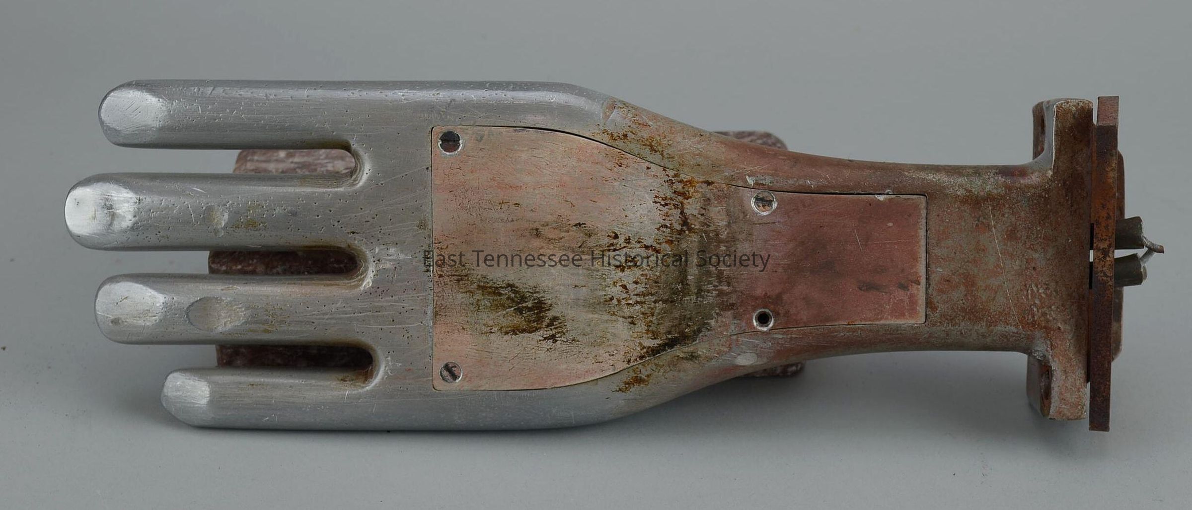a) Glove mold used at Knoxville Glove Company (hand with four fingers, no thumb), solid gray metal with lighter gray metal plate affixed with screws, mounting hardware attached to each mold (not included in measurements), manufacturer unknown, 13 7/8"h x 4 5/8"w.