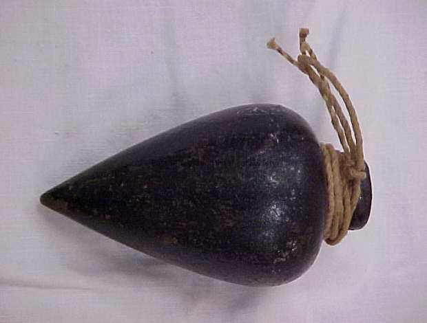 Plumb bob. Cast iron. Seam on sides of bob where it was cast. String has been threaded through top. Surface is black, possibly paint.Collection
