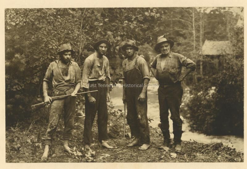 Photograph taken in Tenn. by U.S. Forest Service ranger, hung in Forest Service office, Missoula, MT, gifted to Joe Kemp, 1951.In 1951 Joe Kemp was employed for the U.S. Geological Survey in Denver. In that same year, he was assigned to work temporarlily with the U.S. Forest Service in Missoula, MT. The woman who was the public relations contact in the Missoula office had the "Mountain Men" photo on her wall, and it was already on the office wall when she arrived. The story was that a U.S. Forest Service employee had taken the photo somewhere in Tennessee. Kemp couldn't remember about the date of "1915" that is assigned to it, although several at ETHS think that seems too early, going by the mens' appearance.