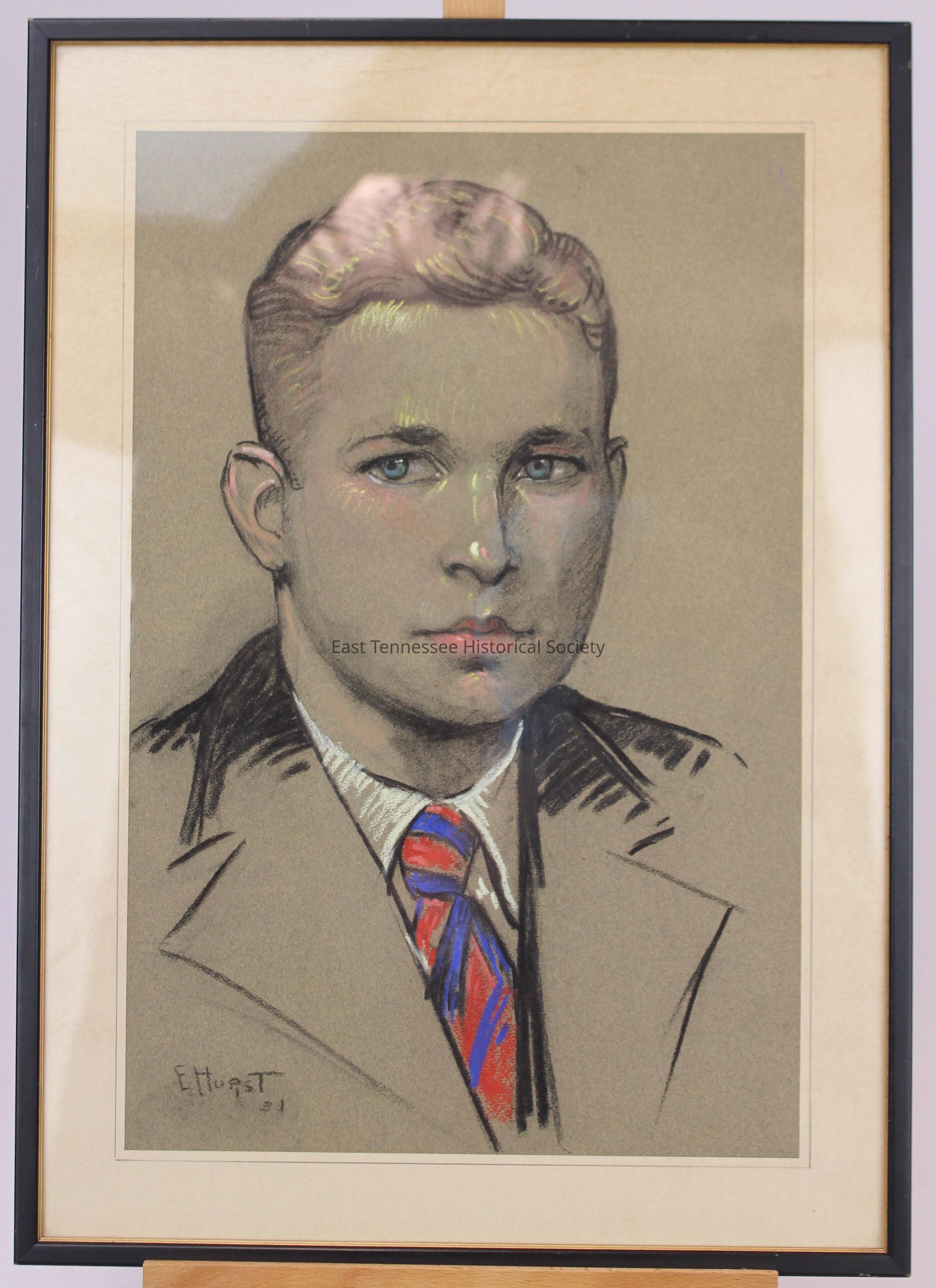 Self-portrait by artist Edward H. Hurst (age 19), pastels on light brown paper, depicts young man with wavy brown hair/blue eyes/square face wearing white shirt with red-and-blue striped tie/dark suit jacket with wide lapels, signed and dated "E. Hurst 31" [1931] at bottom right corner, brown paper fastened to cream paper with thin black line 1/4" out, label on reverse reads "The Picture Framery / E. G. Gagg Prop / We Do the Framing and Never Disappoint / Knoxville, Tenn.,". Black wood frame with gold liner, glazed, eye hooks and black twist wire at upper reverse, 22 3/4"h x 18 1/4"w, 1931.Made/Created