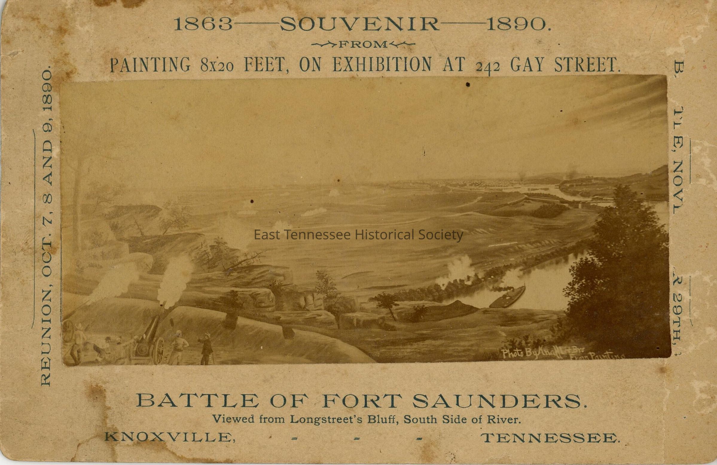 Mounted photograph (5 1/2" x 2 5/8") of "Battle of Fort Sanders [Saunders] painting* on card (6 1/2" x 4 1/4"), marked 1863 SOUVENIR 1890/ REUNION, OCT. 7, 8, AND 9, 1890," S.B. Newman Co., 1890.