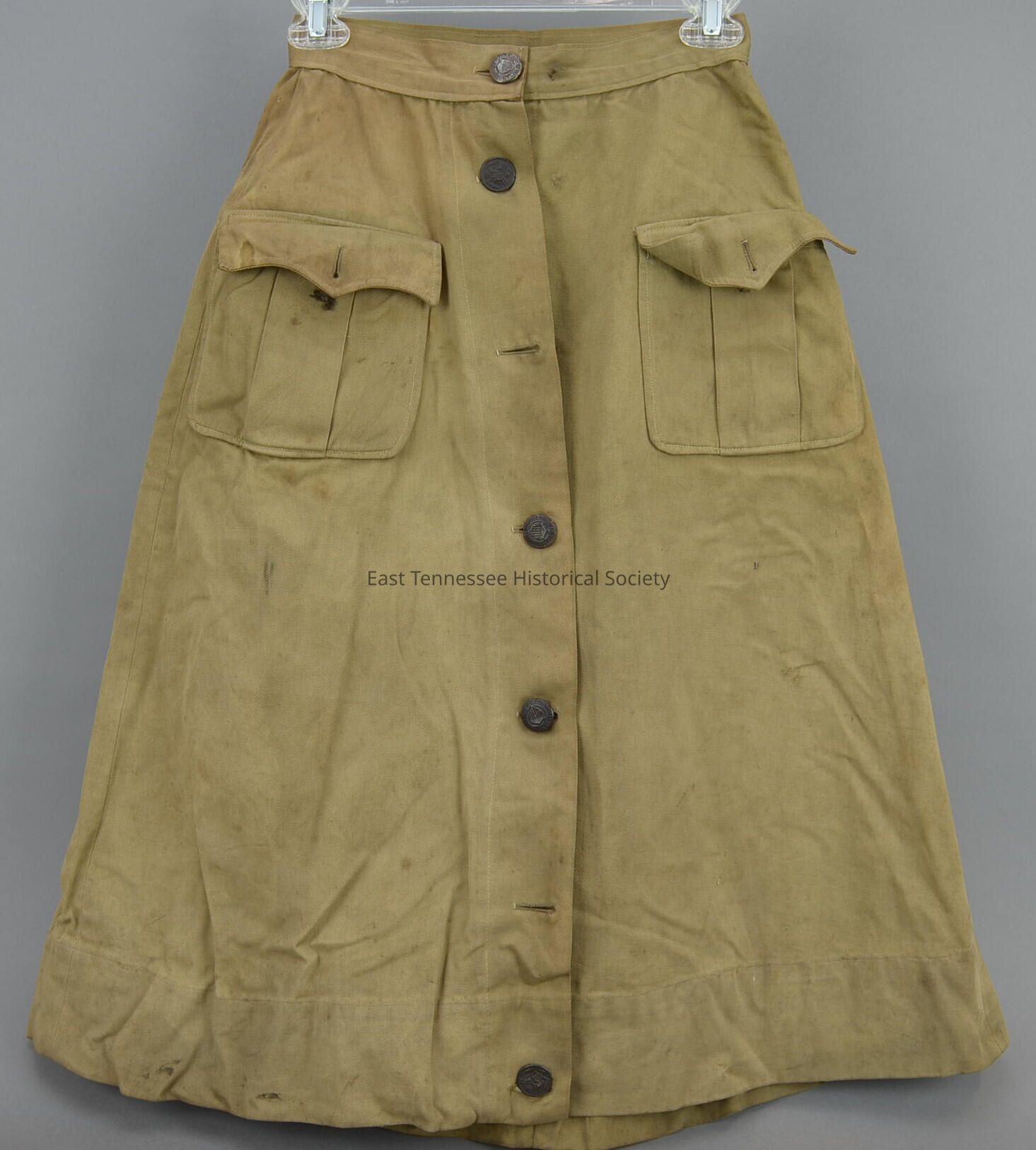 b) National League of Woman's Services (NLWS) Motor Corps uniform skirt of Lucy LaForge, light olive heavy twill and metal, flared and gathered, button front, two pockets with button flaps, 28"h x 12"w, WWI/c. 1918.Made/Created