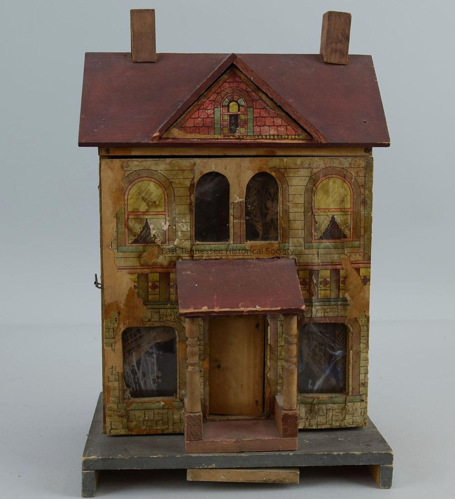 Dollhouse of Hazel Leone Kinsland, wood with lithographed paper covering exterior, two story with front porch with turned posts, red roof with small dormer, doors and windows on three sides, right side entry with hinges on back side, no details on interior, manufactured by Converse Company, 10"h x 13"w x 12 1/2"d, c. 1920s.Made/Created