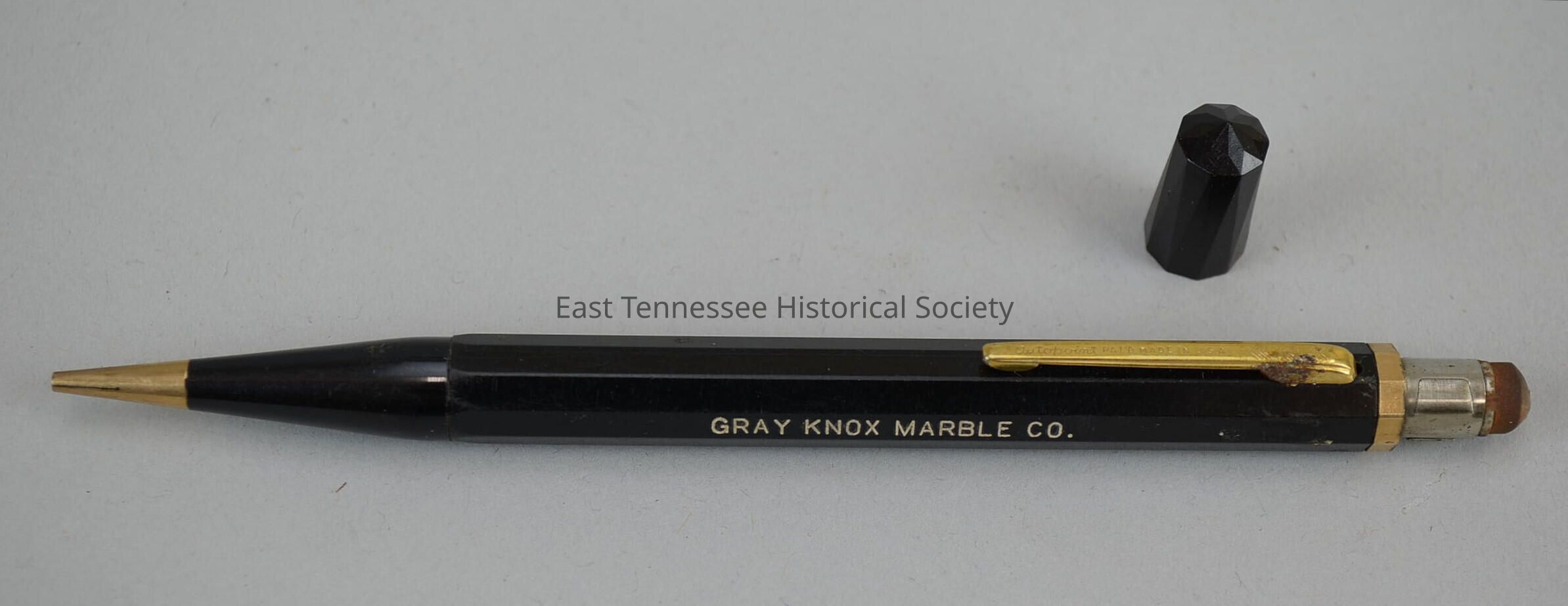 Lead pencil, black plastic casing embossed "GRAY KNOX MARBLE CO." on side, gold metal band at eraser and at point, gold clip, lead remains in barrel, manufactured by Autopoint Company, 5 7/8"h x 1/2" diam., 1929-1956.Made/Created