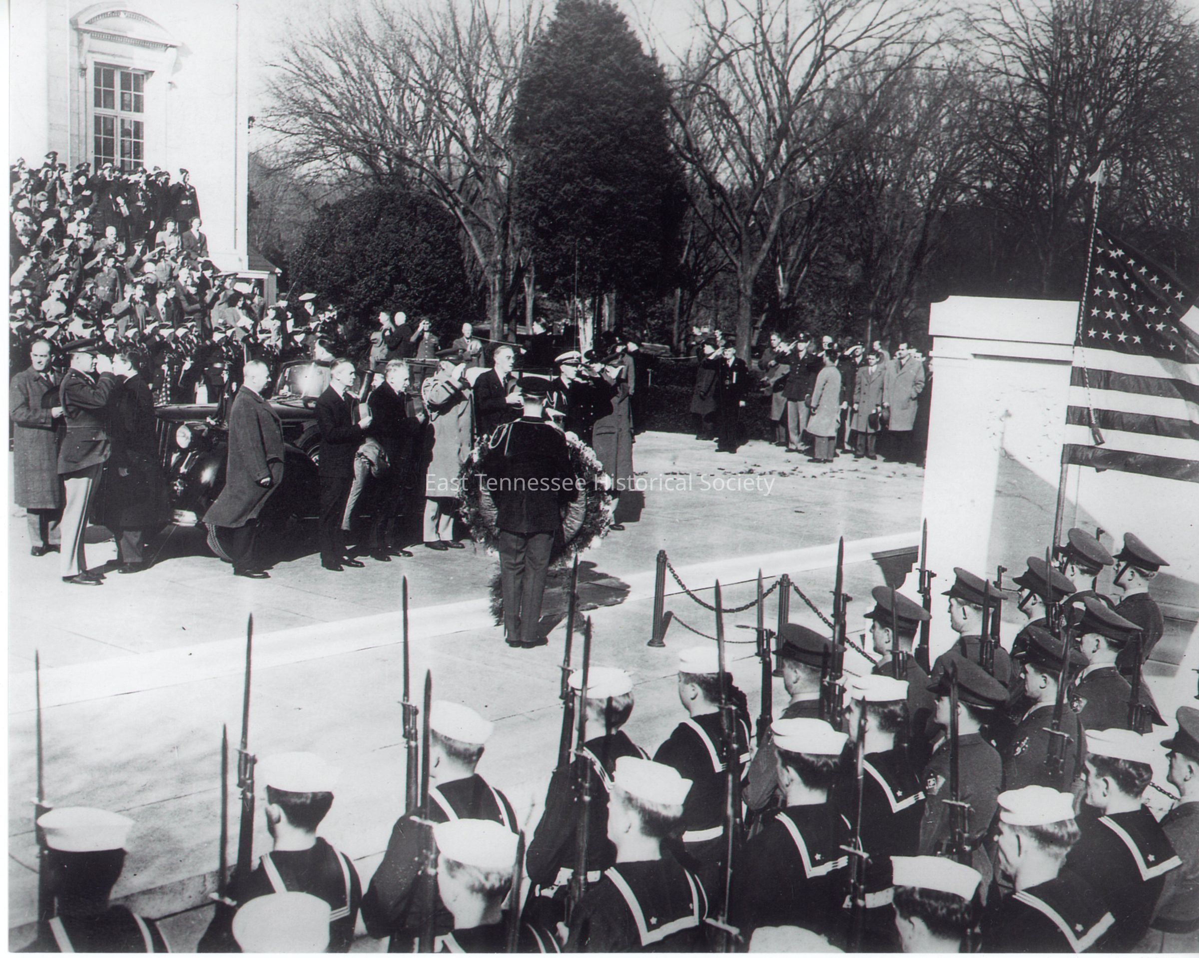 Copy print showing President Roosevelt and a large number of his cabinet and staff performing duties at the Tomb on the Unknown Soldier in November 1944, 8" x 10", 11/1944. R. B. Farmer is among the honor guard--first Marine right of sailors on front row.Dimensions