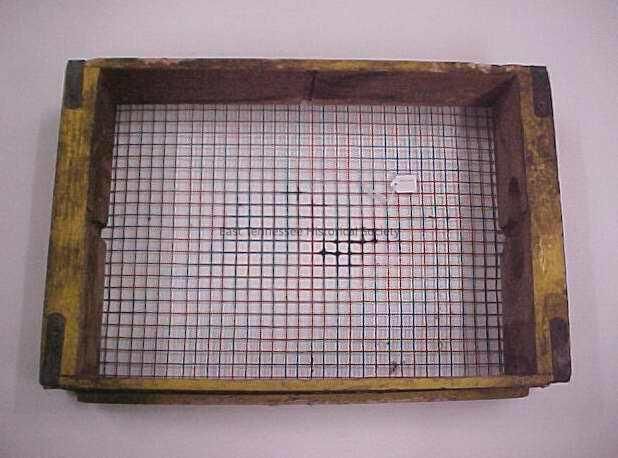 Dirt sifter created from a Knoxville Pepsi crate by James Bruce McKamey, wooden box marked "PEPSI" on both long sides and "Knoxville, Tenn/ 4/ Cartons/ Drink/ Pepsi-Cola" on each of the shorter ends, yellow-painted wood with blue lettering, wire mesh attached to bottom, 4 1/2"h x 19 1/2"w 13"d, c. 1954.Dimensions
