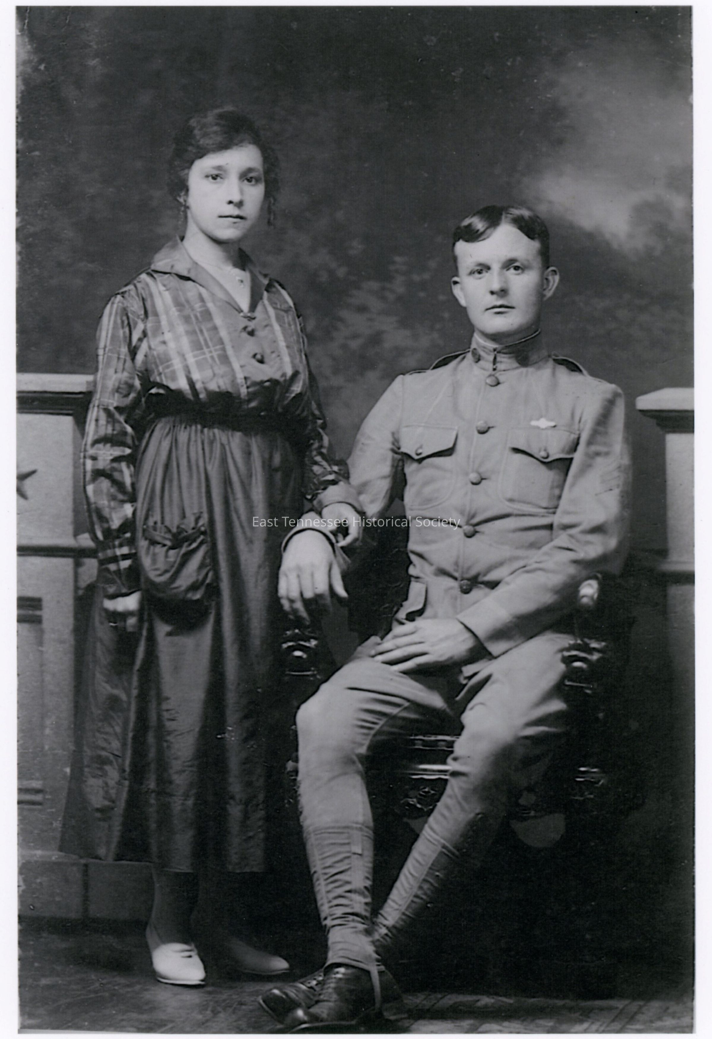 Copy print of a seated Arthur Caleb Harrison in uniform with his wife, Marie, standing by his side; paper 11"l x 8 1/2"w/image area 7"l x 4 1/2"w, 1918.Dimensions