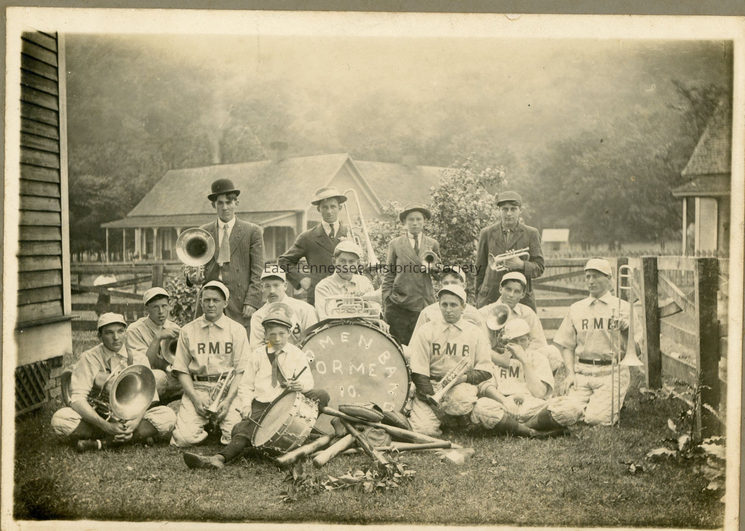 Sepia photograph of 10-member baseball team sitting/kneeling on ground/4 males stand behind in suits/young boy sits at front with small drum, others hold horns (trumpets, bugles, etc.), large drum marked "[?]D MEN BAND/ ORME/ 10" sits at center, wood fence and houses in background, "RMB" on uniforms (for Red Men Band), 1907-1912. "10" on drum may stand for the number of men in the band.