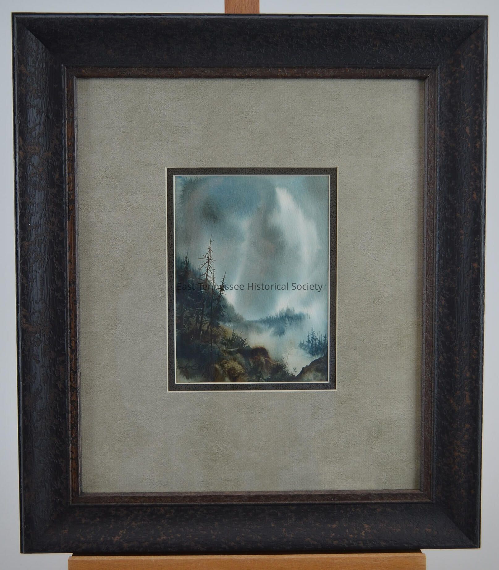 a) Transparent watercolor (painted wet on wet) on paper, mountain with mist over ridgeline/forest landscape with pine trees in dark greens and blues, signed "Jim Gray" at lower left corner, sight line 6 1/2"h x 4 3/4"w.