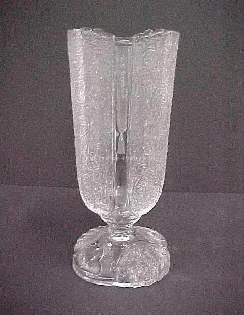 Celery vase, clear colorless/pressed/American glass, "Shell & Tassel" pattern, four sided, scalloped corners with flat panel on sides with tassel, corners are heavily patterned with lacy shell design, short plain stem, two corners at base with shells and two with pebble glass and tassel, manufactured by A. Heisey, 8 3/4"h x 3 1/2"w x 3 1/2"d, late 19th century.