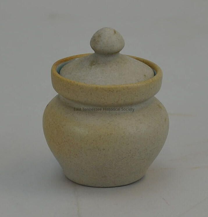 a) Tea set--sugar bowl, matte beige ceramic with aqua gloss glaze on interior, styled with flared top, base stamped "The Pigeon Forge Pottery" in black script, Pigeon Forge Pottery, 2 1/8"h x 2 1/2" diam, late 1950s-early 1960s.