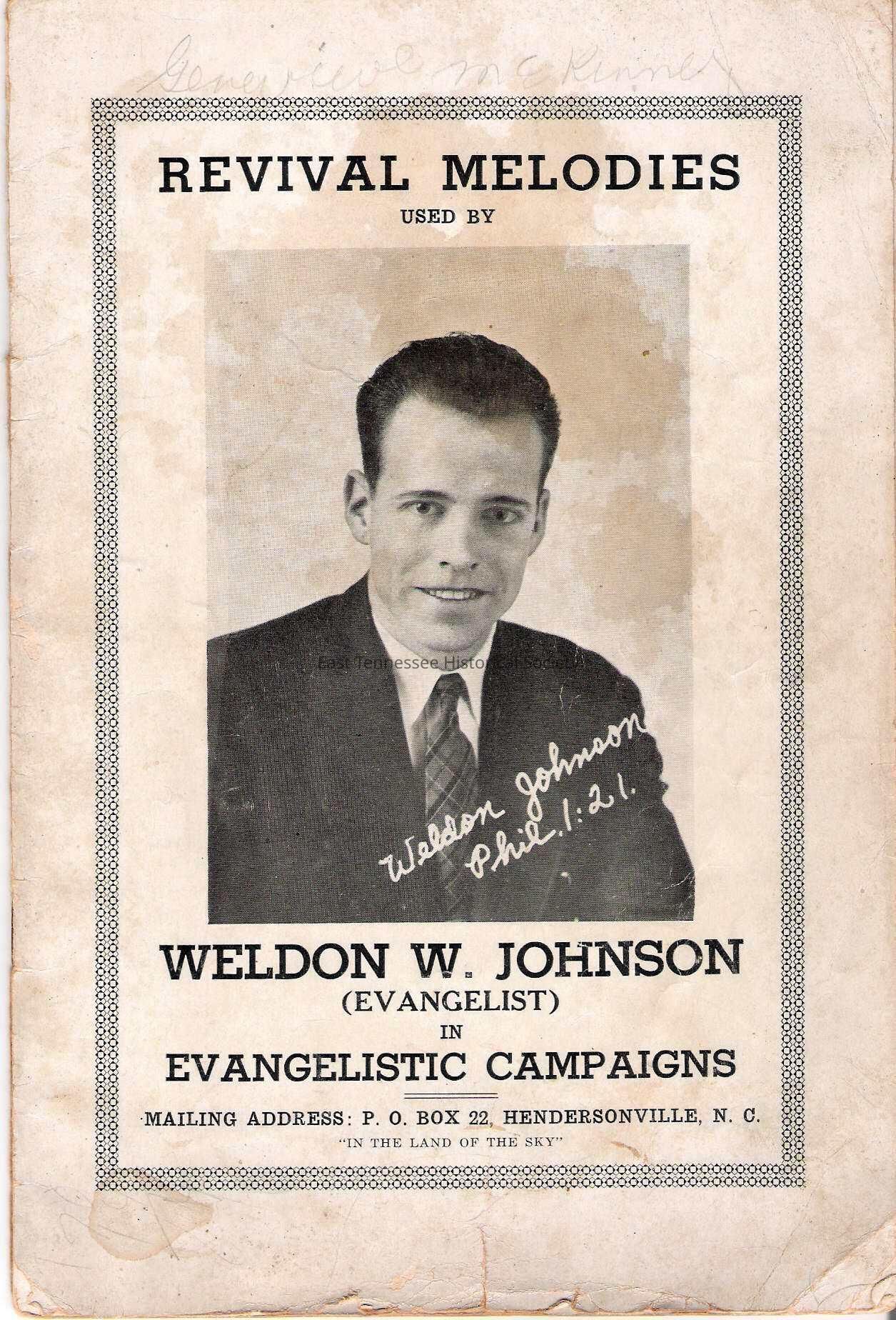 Songbook, white paper cover marked "REVIVAL MELODIES/ USED BY/WELDON W. JOHNSON/ (EVANGELIST)/ IN/ EVANGELISTIC CAMPAIGNS" with photo, "Genevieve McKinney" written in pencil at top front, Flanagan Printing Co., Hendersonville, NC, 23pp, 9 ¼"l x 6 ¼"w, post 1941. Fair, light brown stains on front cover, paper tears and losses on front and back pages along bottom edge, light foxing throughout, areas of abraded paper (p20), many lower right corners folded back/creased. $5Dimensions