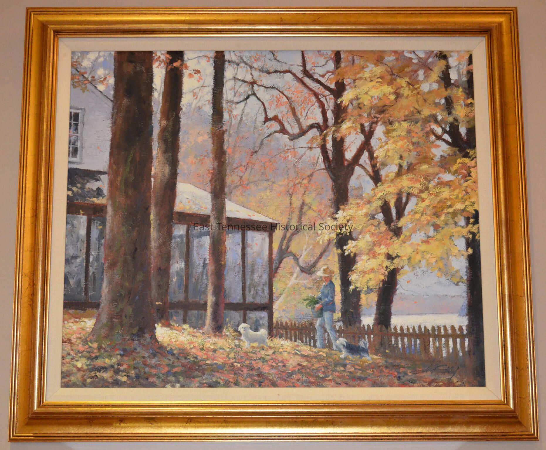 a) Painting entitled "A Happy Day" [Fran Gray with dogs walking outside of Jim's home studio], oil on paper, singed "Jim Gray" at lower right corner, 19"h x 23"w, date?