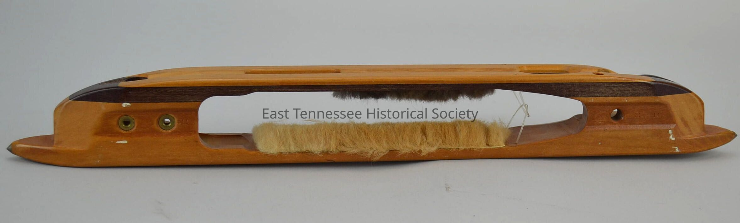Flying shuttle, light wood (perhaps dogwood) with darker wood accent/metal/plastic/animal fur, "WOOD" behind first brass hole, "811" behind next brass hole, '[superimposed] SH" and "1122 14" at plain hole at rear, large opening at center with 6" length of light-color fur on bottom front and 3 1/2" length of dark-color fur on top back, loops of nylon or plastic thread attached at top and bottom behind fur, shuttle blanks made by Tallent Block Mills (Bearden/Knoxville)/shuttle manufacturer unknown (said to be North Carolina), 2 1/4"h x 18 1/2"w x 1 1/2"d, possibly 1950s-1960s.Made/Created