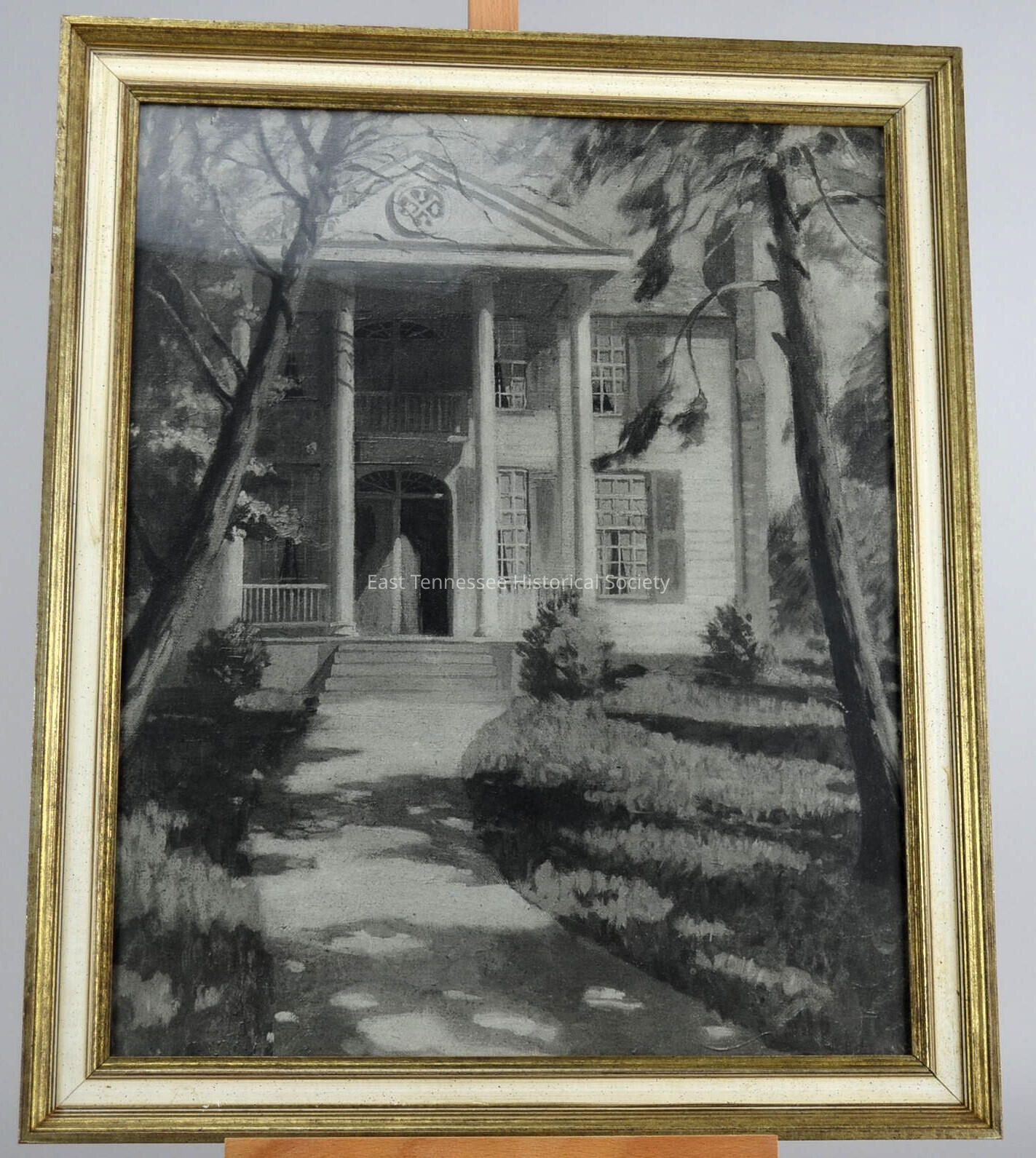 b) Frame, wood painted antique gold on inner and outer sections, label on reverse marked "PORTRAITS / MINIATURES / PICTURE FRAMING / KNAFFL & BRO. / SINCE 1884 / KNOXVILLE 19, TENNESSEE," glazed, hanging wire, 24 3/8"h x 20 1/2"w x 1"d.Dimensions