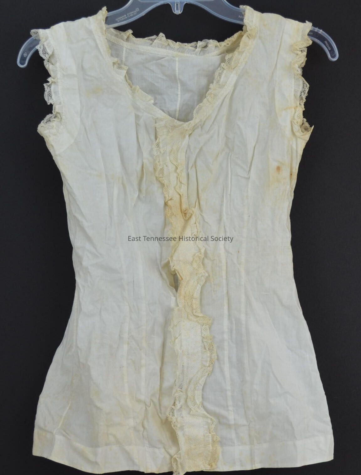 Camisole, fitted, wide neckline with 1/2" cloth and 1/2" lace ruffle, same ruffle around armholes and front pocket, flat lace down middle placket, eight-button front opening with handmade hidden button holes, armhole and hem faced, made in nine tapered sections-front sections shaped with two darts on each side, mostly handsewn with French seams, zig-zag embroidery below neck and armhole ruffles, unknown maker, 23"h x 20"w/ 14"w at shoulder/101/2"w at waist. mid-19th century?Made/Created