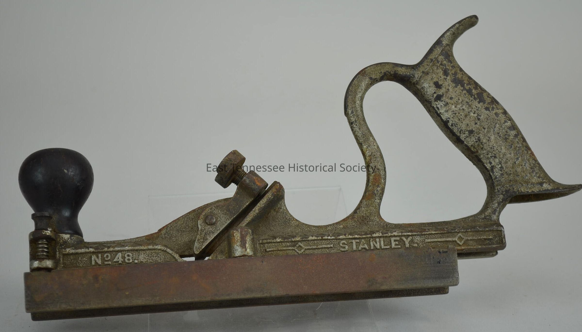 Tongue and groove plane, Stanley No. 48, cast iron with nickel plating and rosewood knob, swinging fence feature/pull screw at front to rotate blade, No. 48" and "STANLEY" stamped above, manufactured by Stanley, ?h x 10 1/2"w x 1 7/8"d, fairly early model because of handle/c. 1898*.