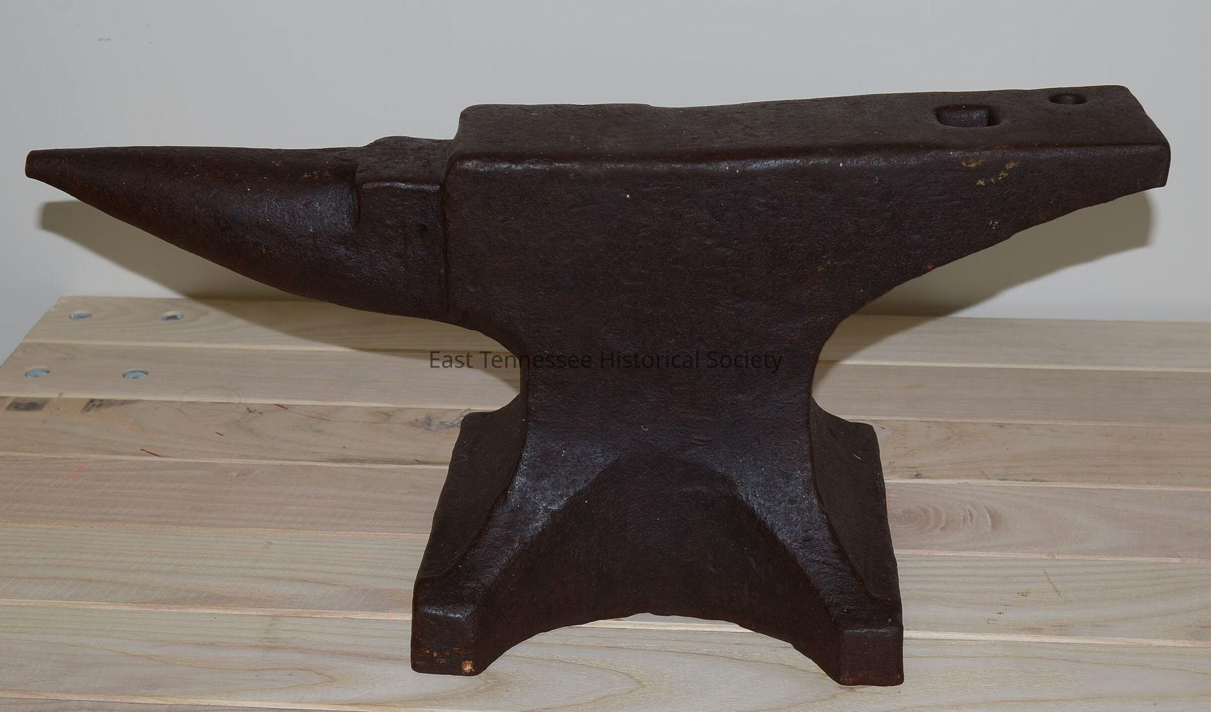 Anvil, Peter Wright patent, iron with brown patina, speckled white paint on top and sides, base stamped "WRIGHT / [PA]TEN[T] / ENGLAND* / [S]OLID / [WROU]GHT" along with numbers 0 3 5**, white (paint?) spot at top left on one end with letter D stamped on either side of lower section [believed by ETHS Collections Committee member] Buford Blanton to be inspector marks], 9"h x 20 1/2"w x 3 3/4"d, after 1910*.