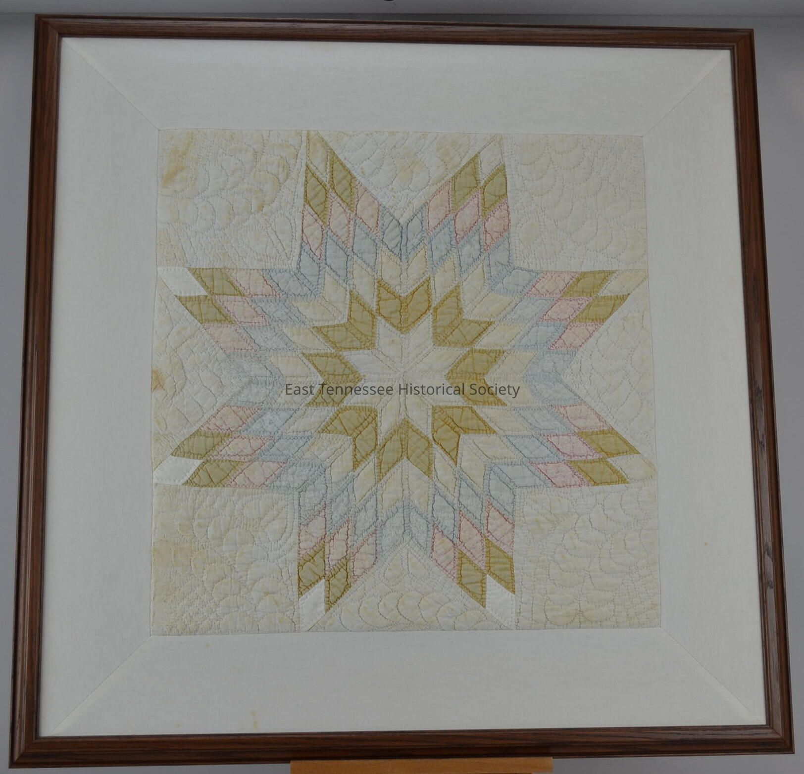 a) Fragment of quilt believed made by Jane Smith for the marriage of her daughter Mary Jane to Dr. Robert Nicholson Fleming in 1843, pieced eight-pointed star pattern, star done in small triangles of pink print/light blue/white/green with white cotton background, sewn to cream cotton duck, solid sectons quilte in flower pattern with hearts quilted at inner points, 22 3/4"h x 22 1/2"w, first half of 19th century.