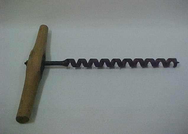 Auger, iron boring screw held to wooden handle by bolt/two screws, 1 1/2"h x19"w x 16 1/2"d, 19th century/1880-1900.Collection