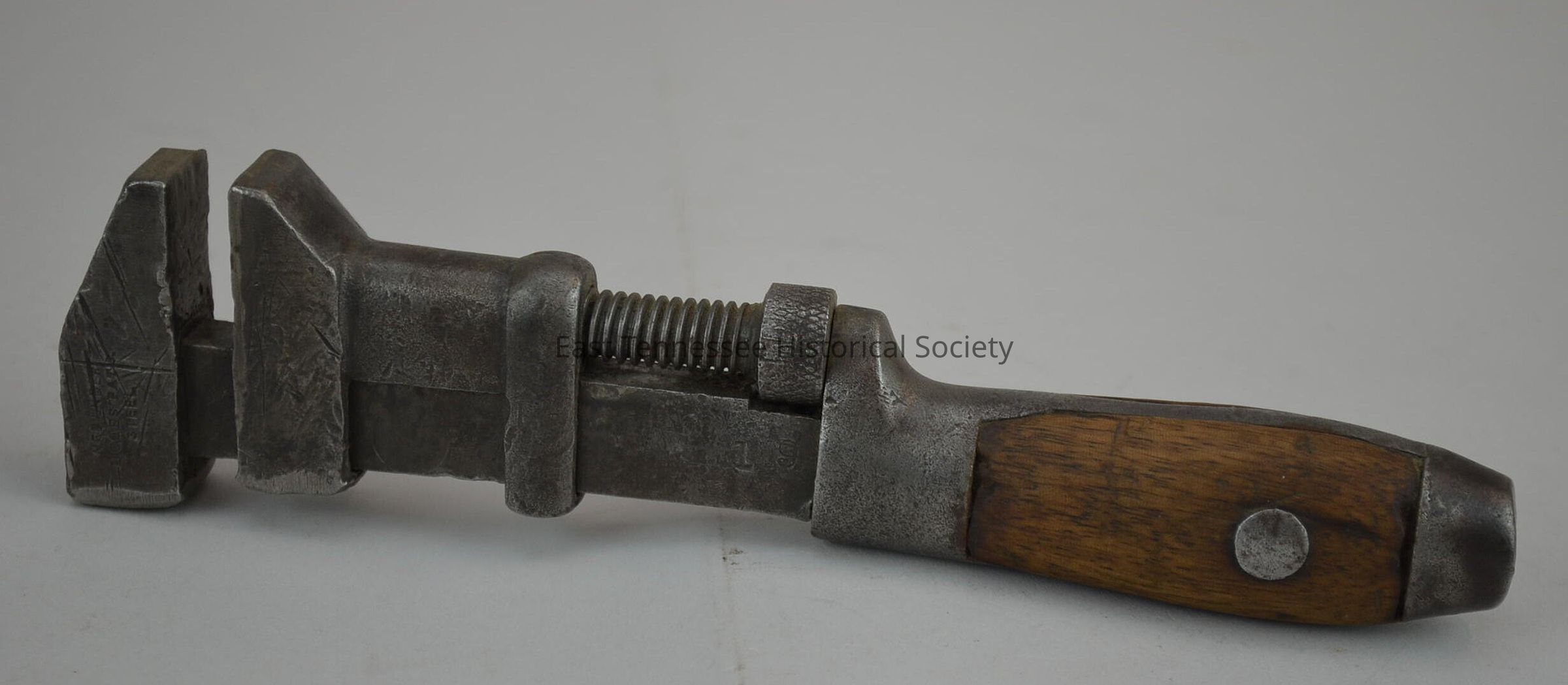 Monkey wrench, metal with wood handle inset into grip with metal rivet, lower jaw adjusts by screw between jaw and handle, c, marked "Coes Wrench Co. / Worcester, Mass." on one side of jaw and "Made under L. Coes Patent Steel" on reverse, stamped "19" and "M23" on opposite side [these may be owner's marks], 8 1/4"h x 2"w, dates after April 1898 [founding of company]/c. 1920s.