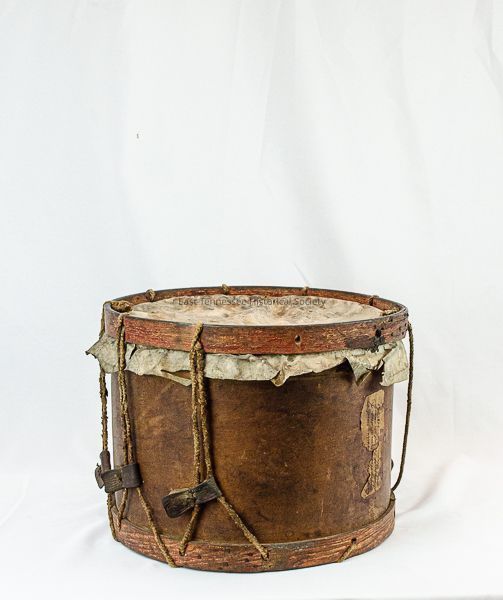 Confederate drum used by Longstreet's men at siege of Knoxville. Found in Camps near Blaine, December 1863. Ox(?)s. badly damaged; bottom missing